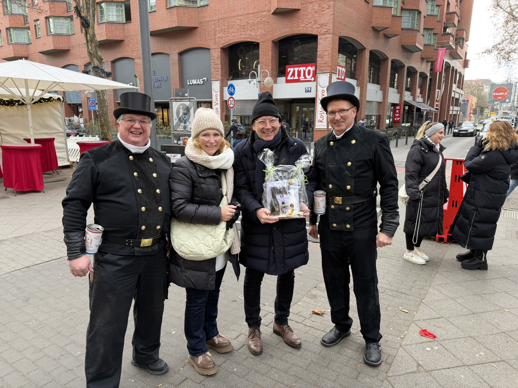 Auch der Mannheimer Oberbürgermeister Christian Specht unterstützte die Sammlung der Schornsteinfeger und kam mit seiner Frau Bettina persönlich auf den Kapuzinerplanken. Obermeister Thorsten Badent und Karsten Schüßler überreichten beiden noch ein nachträgliches Hochzeitsgeschenk.